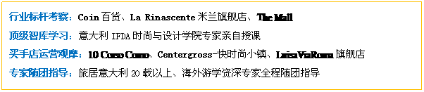 上午:考察意大利最大的百貨集團--Coin米蘭旗艦店,溝通、交流,參觀