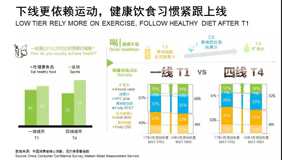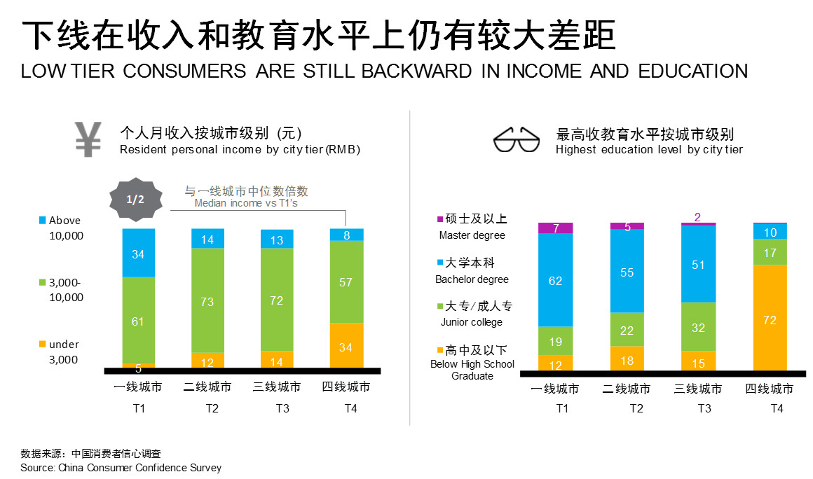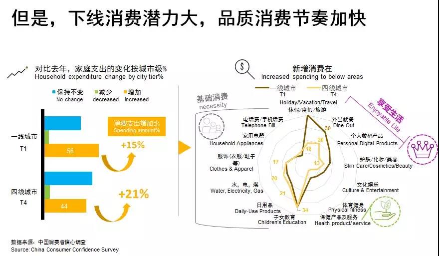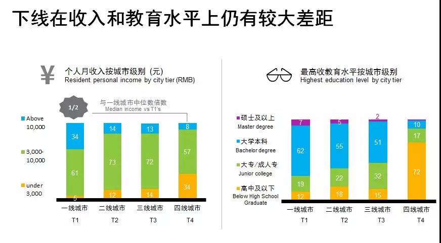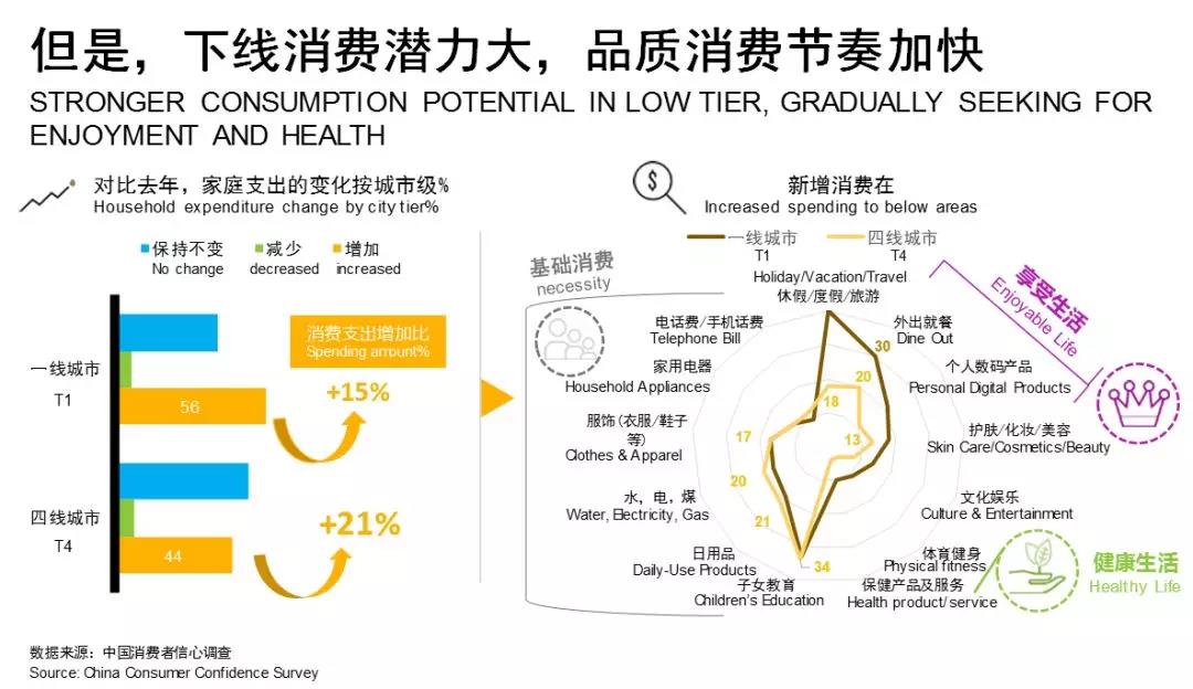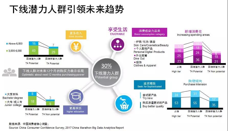 三四線城市消費者在收入和教育水平上和一線存在差距,但在消費上呈現(xiàn)高潛力,一線城市消費者則呈現(xiàn)消費回歸理性的傾向,三四線在享受與健康生活緊追一線,得益于三四線城市的超級消費者去感染帶動周邊的非潛力人群,推動下線整體。