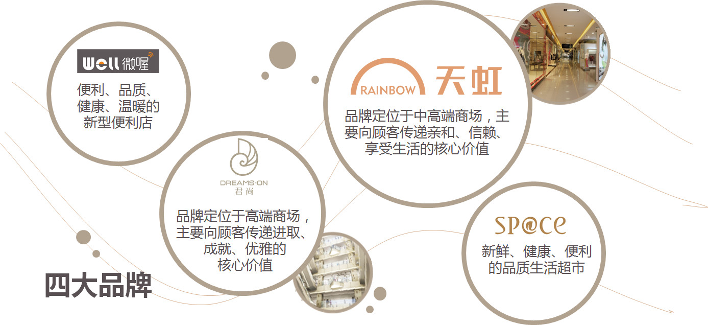 我們品牌有四個品牌,一個是天虹的便利店叫做微喔便利店,一個是天虹本身,面向中高端客戶,服務(wù)中產(chǎn)階級的家庭購物,我們有一個高端品牌叫君尚,比我們天虹本身更高的定位,還有一個超市,天虹在發(fā)展獨(dú)立超市的業(yè)態(tài)取的名字叫做space,我們天虹有八個省25個城市,天虹購物中心有四種業(yè)態(tài)。