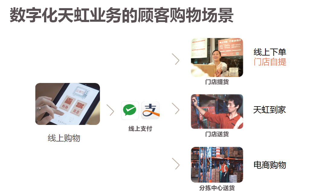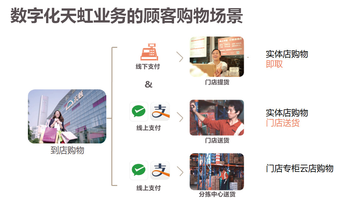 數(shù)字化就是說我們構(gòu)建了新的購物場景,如果顧客到店里消費(fèi)的話,我們可以由幾種支付方式,現(xiàn)在我們天虹96%到98%已經(jīng)實現(xiàn)了專柜會員端直接收銀,超市也完成了自助收銀和手機(jī)收銀,顧客也可以到店馬上拿走,實體店也可以送貨,同時我們百貨商店的云店也可以為顧客提供服務(wù)。就是滿足顧客在不同的場景下的利用線上紅領(lǐng)巾的平臺實現(xiàn)顧客各種場景下的服務(wù)。