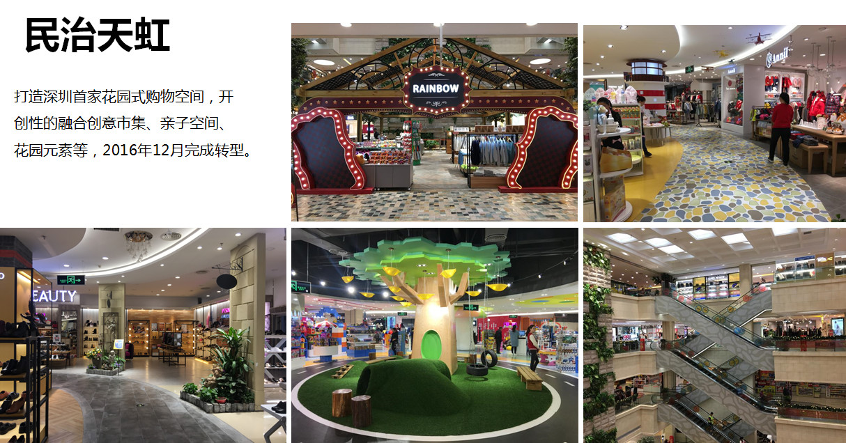 因為天虹的社區(qū)百貨非常多,我們社區(qū)百貨也遇到很大的挑戰(zhàn),面積不是很大,大概兩萬到三萬方,如果沒有那么大能夠引進(jìn)大面積餐飲和配套,一個物業(yè)結(jié)構(gòu)不是很允許,同時經(jīng)營匹配上要滿足社區(qū)生活方方面面的時候,也不允許我們做那么大面積的餐飲,基于這樣一些思考,我們就做了一個嘗試,把我們的典型的社區(qū)店打造了首家深圳花園式的購物空間,我們引進(jìn)很多集市、花園因素,讓消費(fèi)者在你周圍就能夠感受到放松的環(huán)境,同時做到商品的匹配和互動,我們在體驗環(huán)境空間的同時也開展了很多的親子互動和社區(qū)的互動,也收到了非常好的效果,感覺大家不是像傳統(tǒng)的百貨了,其實這個投入也不是很大,找到一個好的設(shè)計師很重要。并不是說我們軟裝有很大的投資,其實你的設(shè)計也很重要。