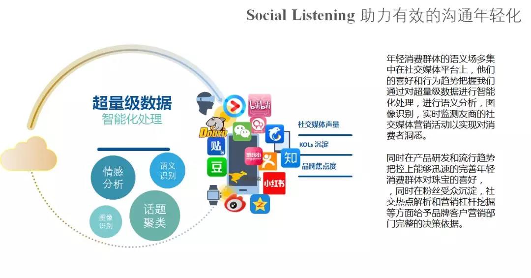 這些時候,消費者的喜好,所到的場所感受都不一樣,現在說都是灰塵化的時代,不是碎片化的問題,這個品牌怎么樣跟消費者去接觸,讓消費者知道我是誰,我是干什么的,這個蠻重要的,因為董事長提出我們的(英)一聲IDo,一生我愿意。這兩年因為變化,消費者更年輕了,我們變成了(英)I Do,希望在任何環節,有愛情的地方,都有我們,我們是一個愛情的體現,這個時候我們面臨怎么樣去找到我們的消費者,怎么樣知道我們消費者在干什么,每天在說什么,他們將表現什么,張揚什么,他們想得到什么,我們需要借助很多的社交媒體,獲取他們這些信息和感知。