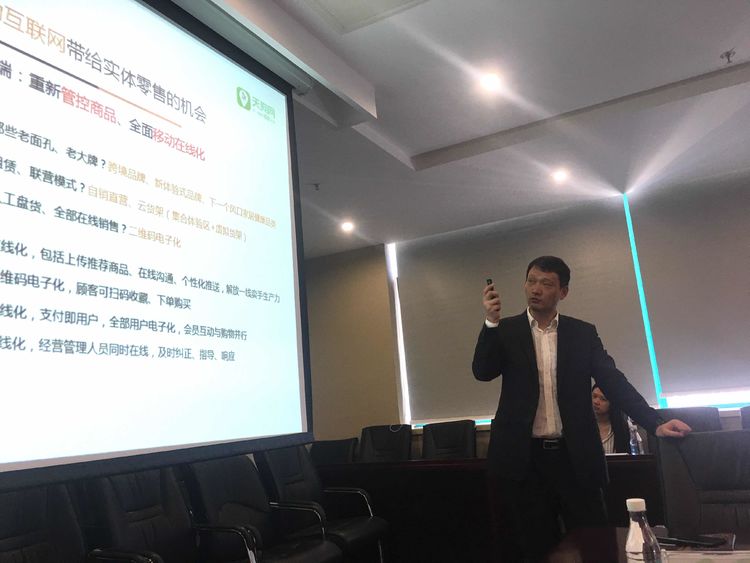 圖為大商集團劉思軍總裁分享:“天狗網如何做到兩年銷售額破百億,助力實體店擁抱互聯網”