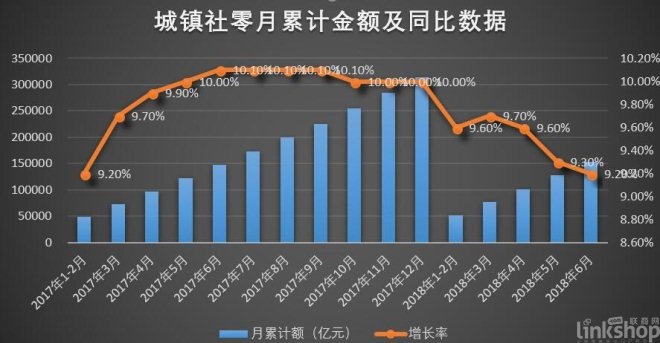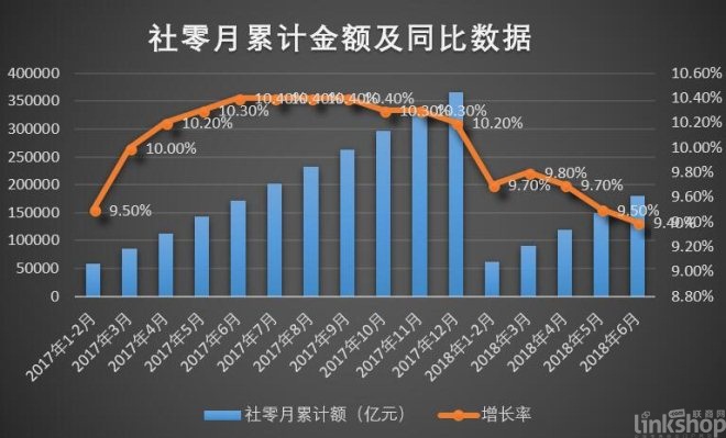 雖然國家統(tǒng)計局數(shù)據(jù)顯示,1-6月份,我國社會消費品零售總額(以下簡稱社零)為180018億元,同比增長9.4%。但從總體看,上半年整個社會零售環(huán)境正逐漸惡化。總體呈現(xiàn)以下幾個特點: