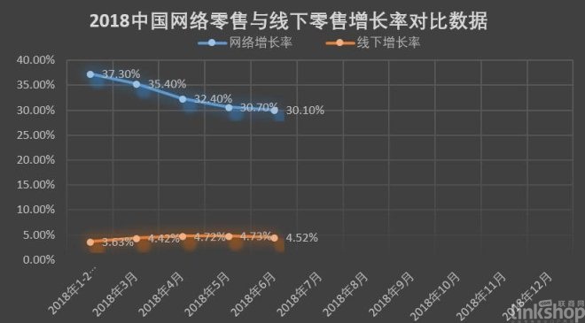 另一方面,電商與實體的融合也讓實體零售開始了緩慢的復蘇。據(jù)《聯(lián)商網(wǎng)》統(tǒng)計,2018年1-6月,線下零售累計額同比增長4.52%,雖比1-5月回落0.21個百分點,但比年初有了明顯的復蘇跡象。