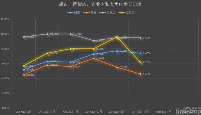 數(shù)據(jù)顯示,2018年1-6月份,限額以上零售業(yè)單位中的超市、專業(yè)店零售額同比分別增長7.4%、9.5%。基本趨勢平穩(wěn),而超市方面則從去年一季度到今年一季度一整年呈現(xiàn)不斷上漲的態(tài)勢。