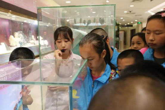 之后,小志愿者們在菜百礦標(biāo)講解員甜甜姐姐的帶領(lǐng)下,參觀了菜百首飾總店四層的寶石博物館。館中的礦物標(biāo)本達(dá)到60余種,其中珠寶玉石種達(dá)到30余種之多,覆蓋范圍之廣,品類涉及之多,質(zhì)量水平之高都是難得一見的,并且,礦物產(chǎn)地遍布澳大利亞,巴西,摩洛哥,印度,贊比亞等14個國家。