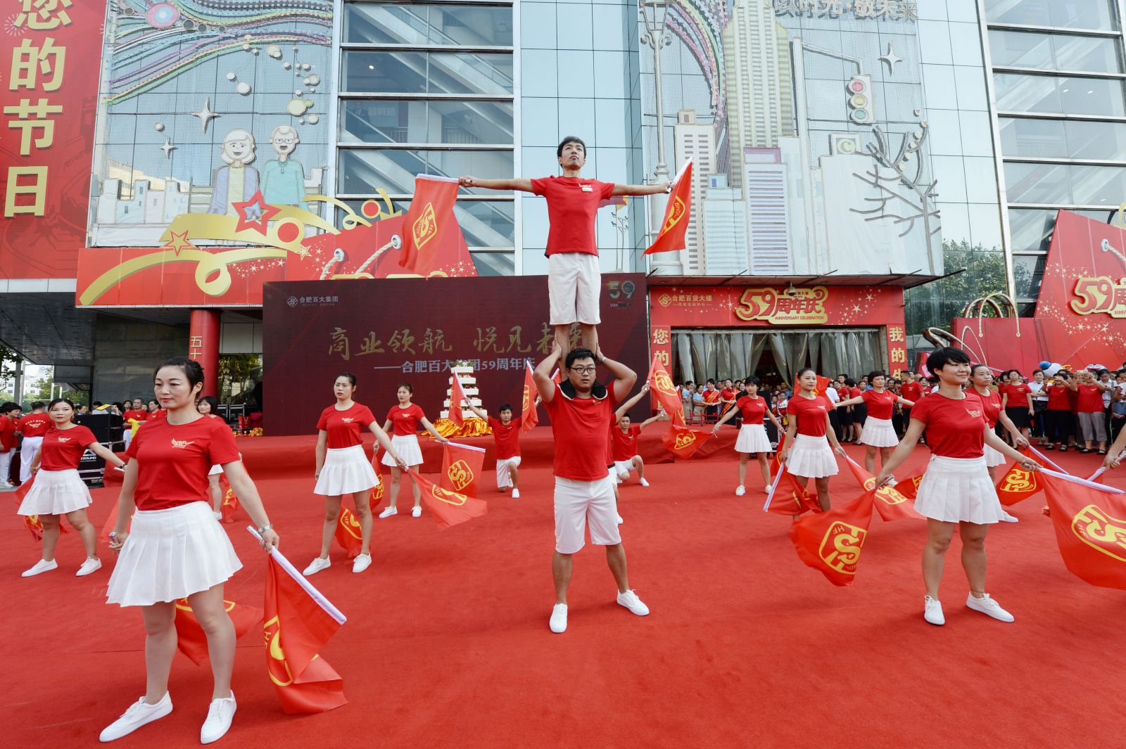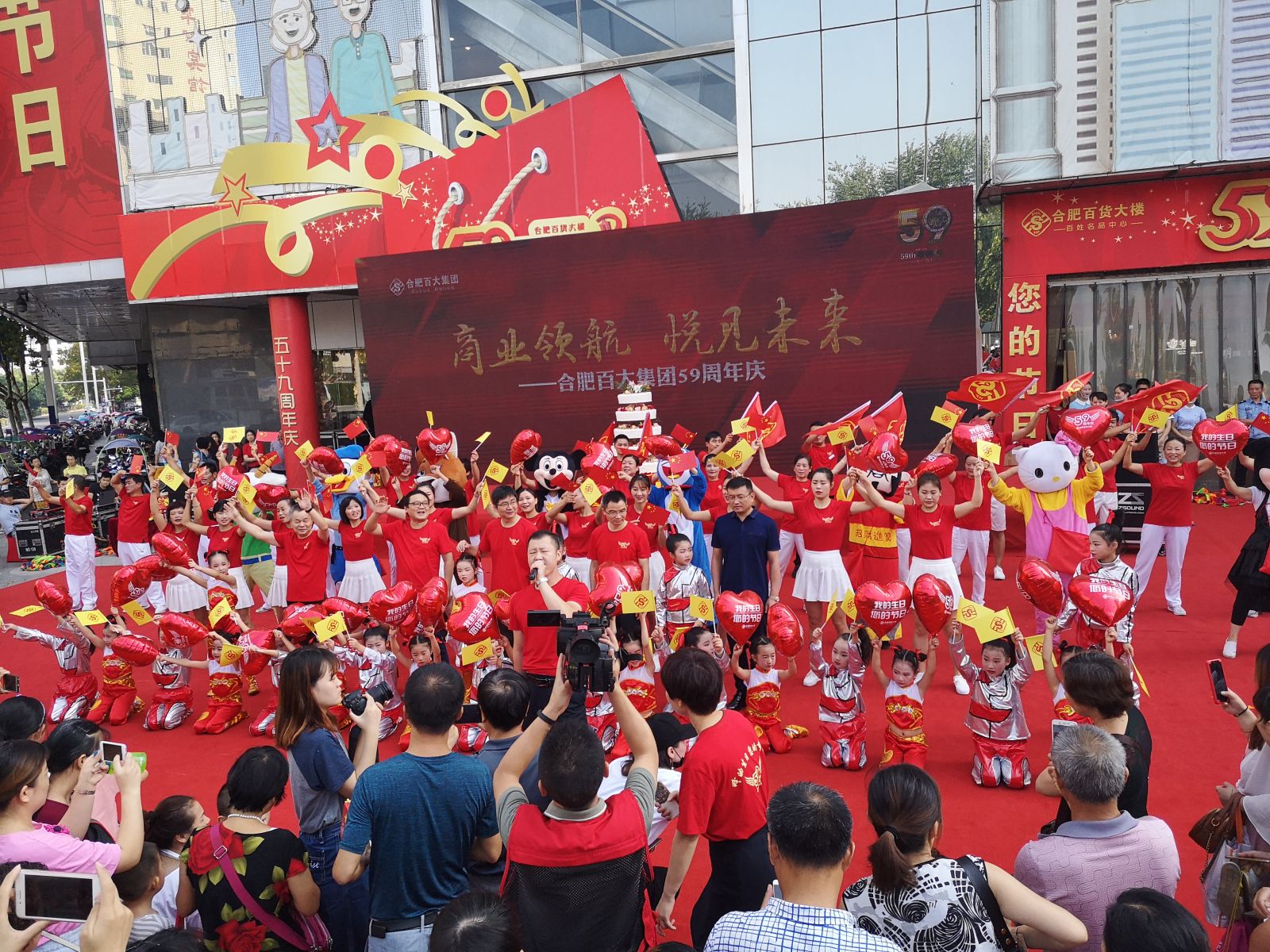 儀式上,合肥百大集團(tuán)員工自編自導(dǎo)了精彩的文藝歌舞節(jié)目,從《鼓舞慶生》到《我要飛得更高》,以龍飛鳳舞的激情演繹百大不斷拼搏的精神,激昂高亢的歌聲唱響百大百尺竿頭更進(jìn)一步的愿景。在節(jié)目中間,員工們cosplay玩偶大熊等可愛(ài)的形象,將店慶禮券和糖果等禮物分享給圍觀的消費(fèi)者。最后,集團(tuán)公司領(lǐng)導(dǎo)、供應(yīng)商代表和員工代表一起為大家分切59歲生日蛋糕,與現(xiàn)場(chǎng)消費(fèi)者、員工共同祝福百大59周歲生日快樂(lè),祝愿百年百大——基業(yè)長(zhǎng)青。