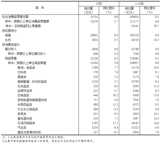 按經營單位所在地分,10月份,城鎮消費品零售額30601億元,同比增長8.4%;鄉村消費品零售額4934億元,增長9.7%。1-10月份,城鎮消費品零售額265318億元,同比增長9.0%;鄉村消費品零售額44516億元,增長10.3%。