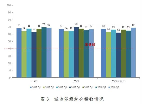 2018年第三季度,分城市能級(jí)指數(shù)表現(xiàn)略有不同。其中:一線城市綜合指數(shù)為69.1,環(huán)比下降0.4,但同比上升1.4。成本的上升是使得一線城市指數(shù)下降的原因。但一線城市在運(yùn)營能力指標(biāo)上仍表現(xiàn)突出:100%的一線城市錄得租金收入的增長,且有88%的項(xiàng)目實(shí)現(xiàn)銷售同比增速的提升。二線城市指數(shù)為67.2,環(huán)比上升1.3,同比上升2.3。二線城市中,有94%的項(xiàng)目本季度實(shí)現(xiàn)客流量的環(huán)比增長。三線及以下城市為69.1,環(huán)比上升3.9,同比上升2.7。