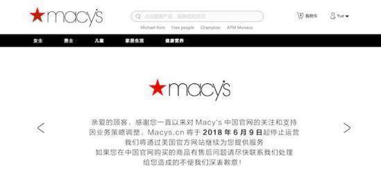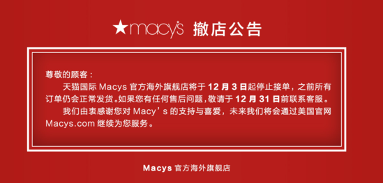 12月4日消息,梅西百貨昨日發布撤店公告,天貓國際Macys官方海外旗艦店從12月3日起停止接單。