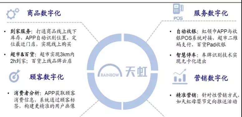 2015年對外發布“新天虹、新零售”戰略,2016年提出“數字化轉型戰略”,2017年將電商事業部更名為數字化運營中心,旨在以虹領巾APP為核心,通過商品、服務、營銷、供應鏈等的數字化,實現全渠道轉型,2018年與騰訊展開合作,成立“智能零售實驗室”,探索零售業務最前沿技術應用。