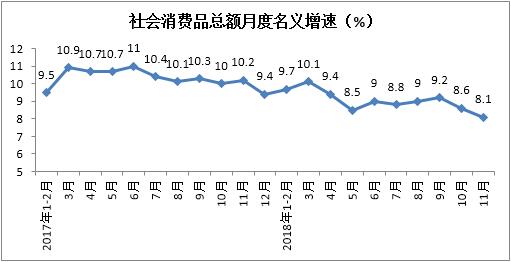 2018年1-11月份社會消費品零售總額實現345093億元,累計增長9.1%,增速較1-10月份放緩0.1個百分點。其中,11月份社會消費品零售總額實現35260億元,同比增長8.1%,增速較上月放緩0.5個百分點。