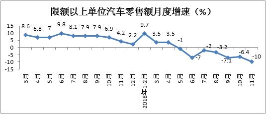 1-11月份,限額以上單位汽車類零售額同比下降1.6%,降幅較1-10月份擴大1個百分點。其中,11月份同比下降10%,自5月份以來,增速連續同比負增長。