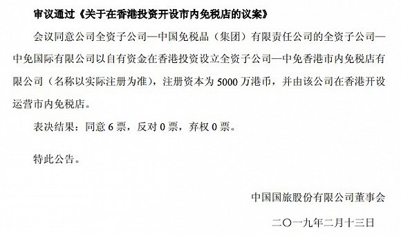 公告顯示,公司公告董事會審議同意在香港開設運營市內免稅店,旗下公司中免國際有限公司(以下簡稱“中免公司”),將以自有資金5000萬港幣新設立中免香港市內免稅店有限公司(名稱以實際注冊為準),新的香港市內免稅店將由中免香港市內免稅店有限公司負責開設和運營。