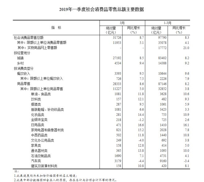 2019年3月份,社會消費品零售總額31726億元,同比名義增長8.7%。其中,化妝品零售額281億元,同比增加14.4%。