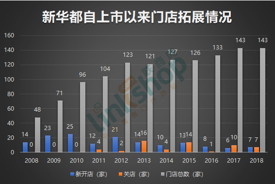 新華都自上市以來門店拓展情況,數據來源:公司財報,聯商網