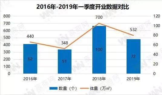 據(jù)贏商網(wǎng)統(tǒng)計,2019年1-3月份,全國開業(yè)購物中心項目約72個,商業(yè)總體量約532萬平方米。