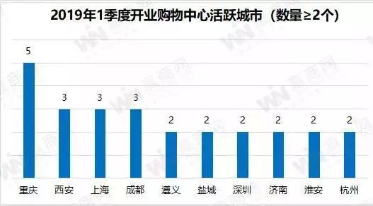從單個城市看,一季度開業(yè)量活躍城市(數(shù)量≥2)共10個,重慶以5個居榜首,上海、西安、成都并列第二,各有3個項目。深圳、杭州、遵義、鹽城、濟南、淮安6個城市各有2個項目。活躍的十個城市,一線城市僅2個,二線城市5個,三線城市2個,四線城市1個。