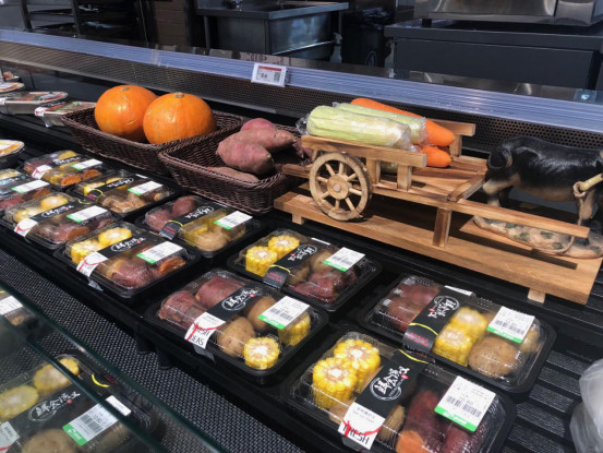 二是位于拐角處的賣肉處,原本有一面墻可以打通,但門店并沒有這么做,他留下了這一拐角,將肉陳列于兩側,員工在內服務,特意營造出一種“集市”的氛圍。這是借鑒泰國一家優秀零售商的做法,事實證明,這種陳列形式也深受消費者喜愛。