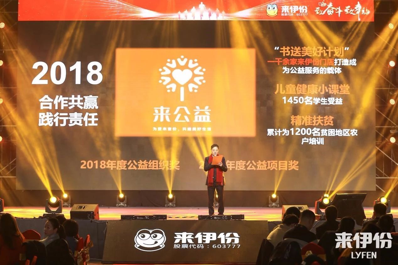 2019年2月11日,農歷大年初七,以“2019,致奮斗致幸福”為主題的來伊份新春團拜會在上海世博展覽館3號館舉行,參會人員包括來伊份高管、店長、營業員、加盟商、內勤工作人員等近萬人。