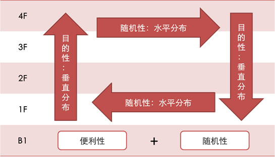 “垂直品類閉環”的原理見下圖。從空間上,將能夠吸引消費者“目的性購買”的“目的性品類”,在賣場各層的動線節點與視覺節點進行垂直分布,促進消費者在賣場空間內垂直流動。使得不同樓層動線起點都擁有導流品類,再輔之電梯打通不同空間,讓整個商場人流動起來。不僅如此,商場還可以利用隨機性品類的布局,在垂直的目的性品類之間水平分布同屬一類風格、生活方式的“隨機性品類”,以達成“隨機性購買”。這樣就從空間上將原本彼此獨立的樓層“拉伸”為一個交互性更強的“垂直閉環”,使賣場的內外部導流能力大大增強。“垂直閉環”能夠發揮出效果倍增的“乘數效應”,這是“品類樓層”簡單疊加所無法做到的。