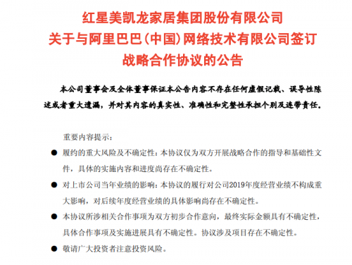 紅星美凱龍家居集團股份有限公司(以下簡稱 “公司”)日前對外發布公告稱,與阿里巴巴(中國)網絡技術有限公司(以下簡稱“阿里”)于2019年5月24日在中國杭州市余杭區簽署了 《戰略合作協議》,雙方將在新零售門店建設、電商平臺搭建、物流倉配和安裝服務商體系、消費金融、支付系統等方面開展戰略合作。