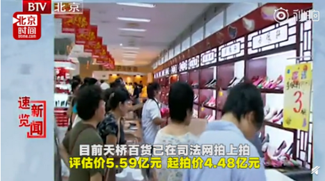中國第一家股份公司北京天橋百貨商場即將迎來命運(yùn)轉(zhuǎn)折。記者昨天獲悉,天橋百貨因借款合同糾紛將被拍賣,目前天橋百貨已在司法網(wǎng)拍上拍,評估價(jià)5.6億元,起拍價(jià)4.48億元。