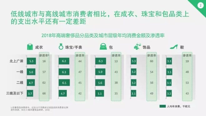 此外,與高線城市相比,低線城市的消費者在成衣、珠寶和包袋品類上的支出有較大差距。奢侈品品牌要觸達這部分消費者還需要在渠道營銷布局上有所創新,并且需要慎重思考產品戰略。