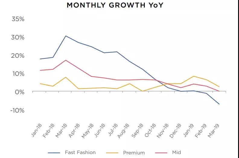 2019年初,各時(shí)尚階層 (快時(shí)尚、中端時(shí)尚和高端時(shí)尚) 的在線訪問量增速均有所放緩。
