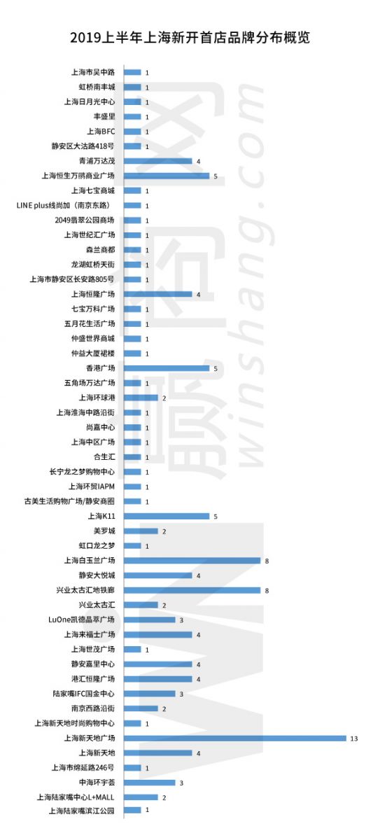 經(jīng)贏商網(wǎng)統(tǒng)計(jì),2019上半年新開業(yè)項(xiàng)目共有11個(gè),新開商業(yè)項(xiàng)目中的首店品牌共有38個(gè),約占上半年開業(yè)的首店品牌總量的32%。其中,上海新天地廣場(chǎng)內(nèi)的首店品牌最多,共有13個(gè),上海白玉蘭廣場(chǎng)和興業(yè)太古匯地鐵廊各有8個(gè)首店品牌于上半年亮相,上海恒生萬(wàn)鸝商業(yè)廣場(chǎng)和青浦萬(wàn)達(dá)茂上半年開業(yè)的首店品牌分別為5個(gè)、4個(gè)。