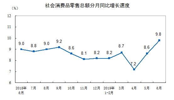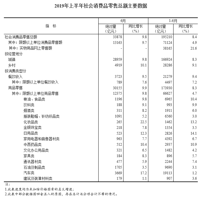 2019年上半年,社會消費品零售總額195210億元,同比名義增長8.4%(扣除價格因素實際增長6.7%,以下除特殊說明外均為名義增長)。其中,6月份社會消費品零售總額33878億元,同比增長9.8%。