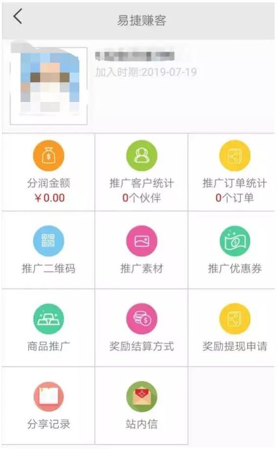 億邦動力從“易捷海購”平臺會員中心找到了“易捷賺客”入口,“易捷賺客”頁面展示了“分潤金額”、“推廣客戶統計”、“推廣訂單統計”、“獎勵結算方式”、“獎勵體現申請”、“推廣素材”等業務板塊。