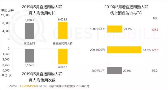 實(shí)際上,電商直播的帶貨能力不言而喻。QuestMobile發(fā)布的《2019年“6.18”電商大報(bào)告》顯示,直播網(wǎng)購用戶群體的人均使用時(shí)長和次數(shù),均高于移動(dòng)電商全網(wǎng)大盤數(shù)據(jù)。值得一提的是,接近8成的直播網(wǎng)購用戶消費(fèi)能力達(dá)到中高水平,體現(xiàn)出強(qiáng)勁的購買力。