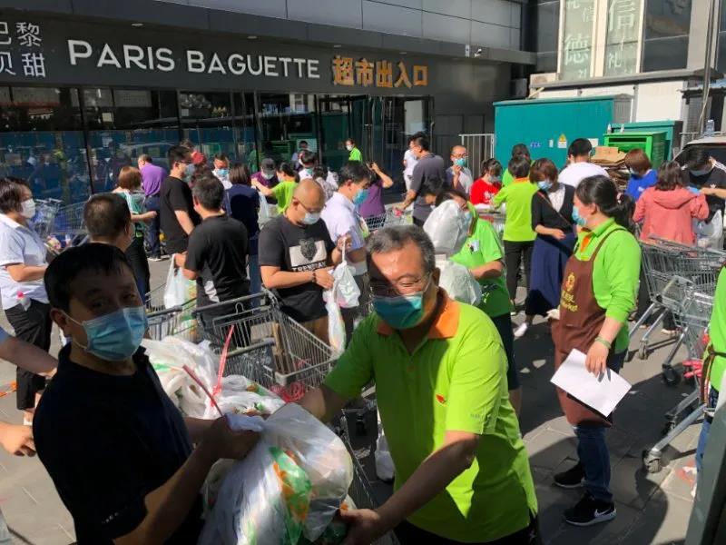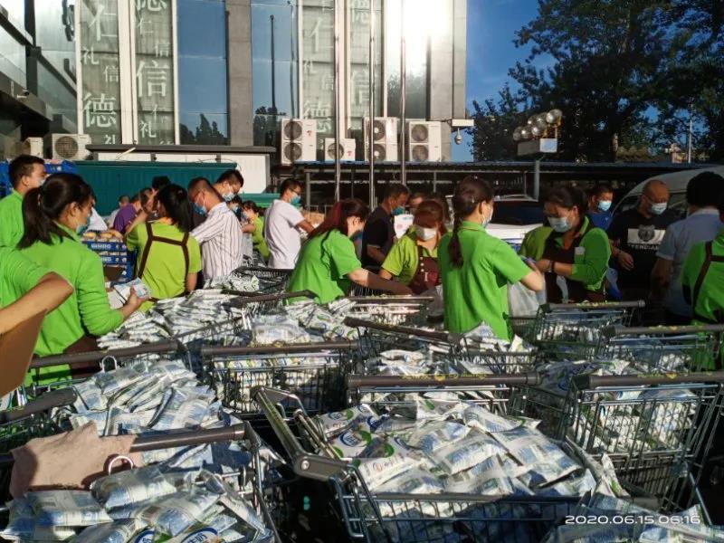 早在6月14日晚10點,超市發便接到緊急任務,為玉泉路周邊10個封閉社區,共涉及4085戶,10215名社區居民配送早餐。超市發第一時間積極響應,在總部各部門工作群內征集志愿者,15分鐘內將幫工志愿者組織到位。